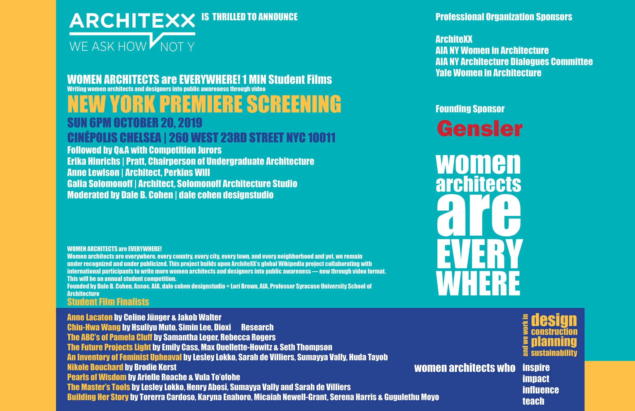 Women architects are everywhere, every country, every city, every town, and every neighborhood and yet, we remain under recognized and under publicized. This project builds upon ArchiteXX’s global Wikipedia project, #wikiD, collaborating with international participants to write more women architects and designers into public awareness — now through video format. This will be an annual student competition. The film project is founded by Dale B. Cohen, Assoc. AIA, dale cohen designstudio + Lori Brown, co-founder ArchiteXX, AIA, Professor Syracuse University School of Architecture.