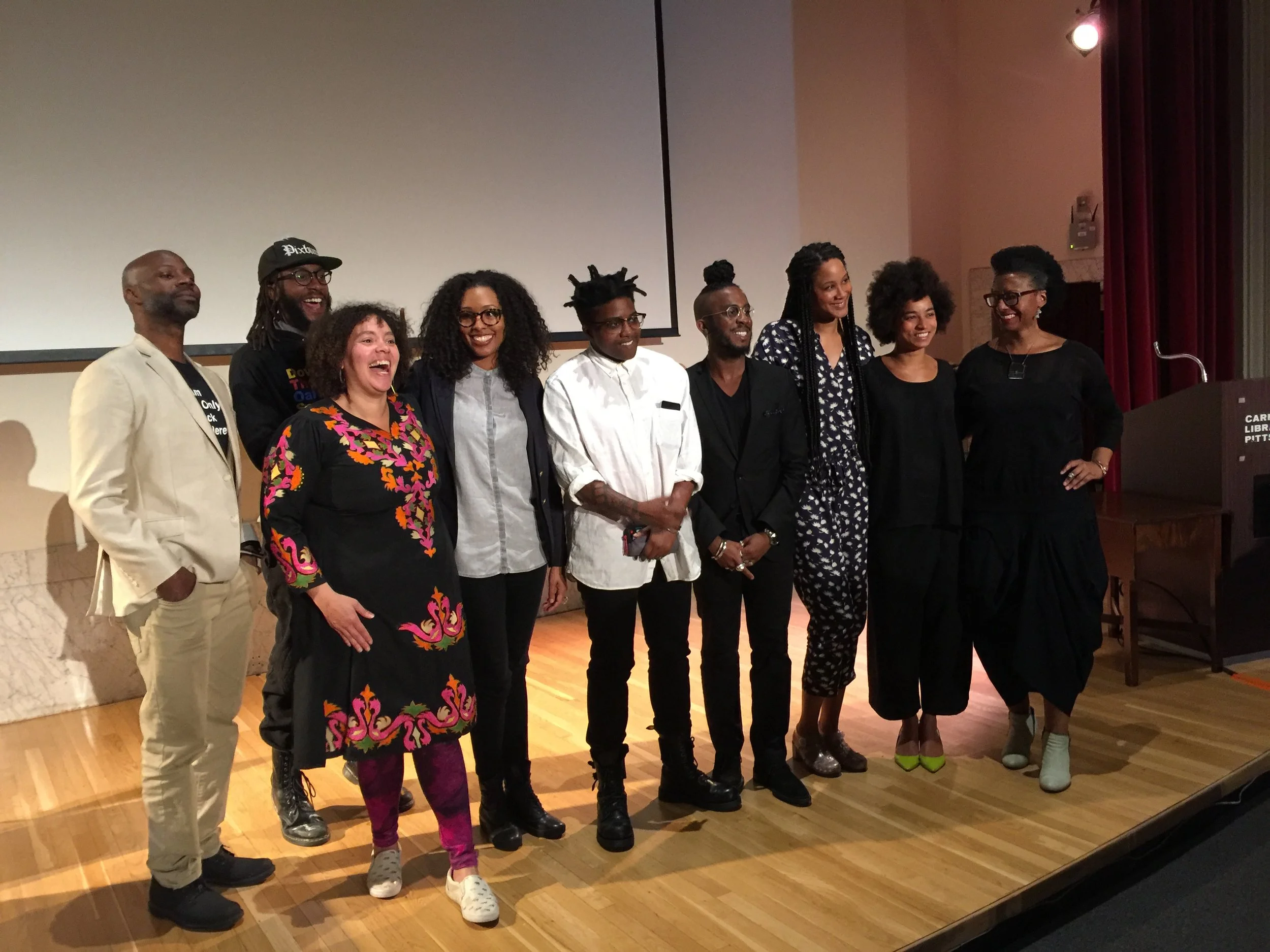 The first By Any Means symposium, Carnegie Library Lecture Hall, April 23, 2016. Left to right: Nathaniel Donnett, Alisha Wormsley, D.S. Kinsel, Taylor Renee Aldridge, Tiona Nekkia McClodden, Ikechukwu Casmir, Jessica Lynne, Rujeko Hockley, and Kilolo Luckett. Courtesy of Kilolo Luckett.
